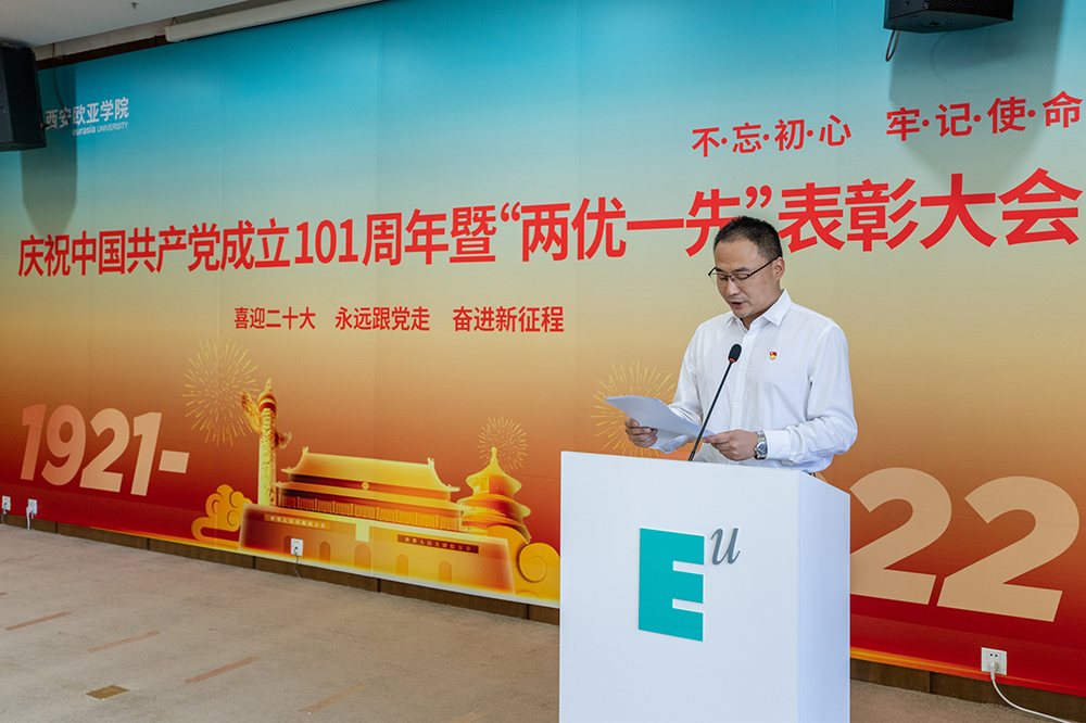 6月29日,我校在图书馆学术报告厅举行庆祝中国共产党成立101周年暨“两优一先”表彰大会。大会由校党委副书记、纪委书记王志强同志主持。学校党政主要领导及优秀师生党员代表参加了大会。
