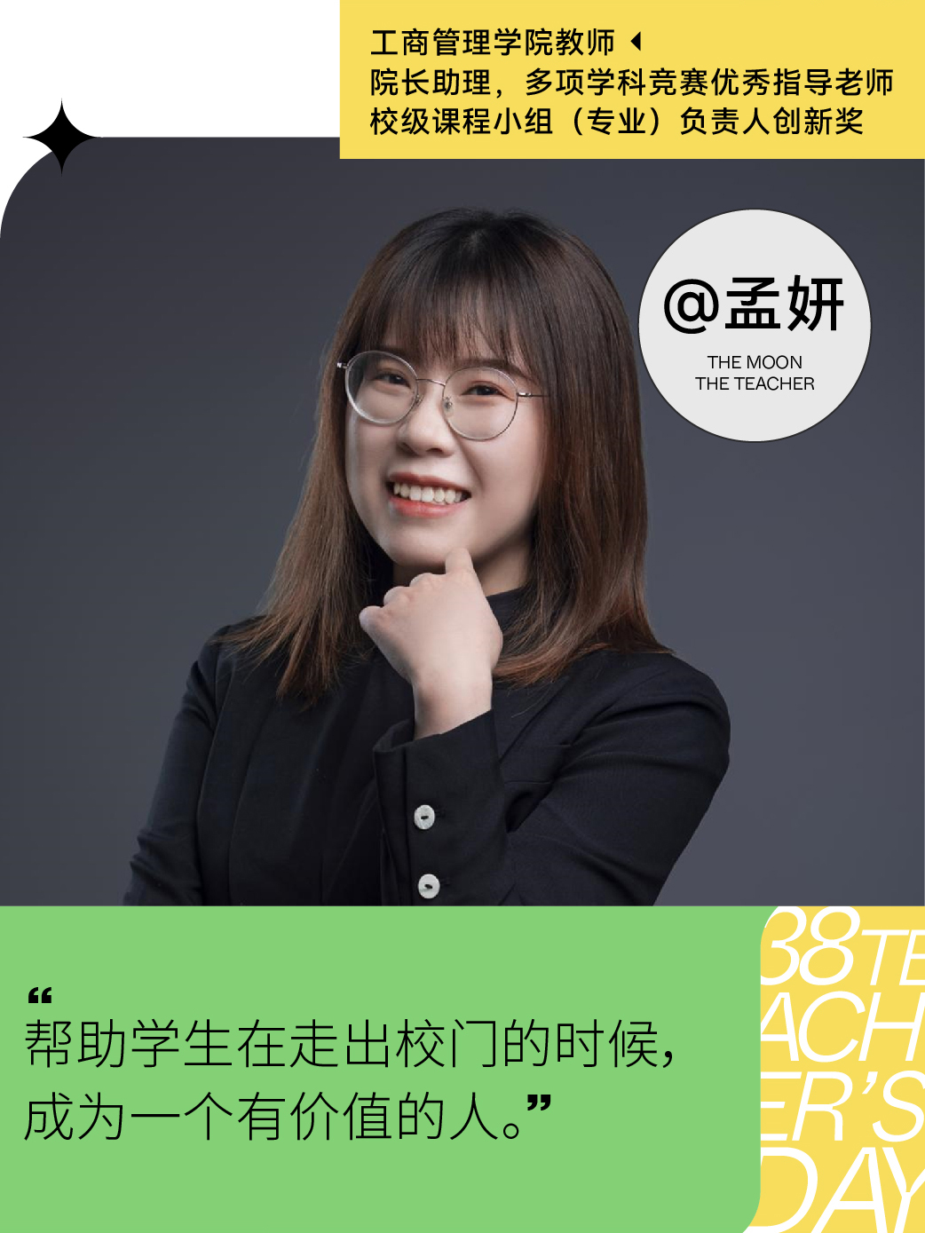 孟老师认为自己对教育事业始终抱有一种新鲜感,她期待能够在之后的路途中不断学习、拥抱变化,保持一种冲劲,保持一种学习的状态。“作为老师,教育这个问题我仍然在摸索,但我认为,教育应该是在帮助学生走出校门的时候帮助他们去适应目前的环境,成为一个有价值的人。”