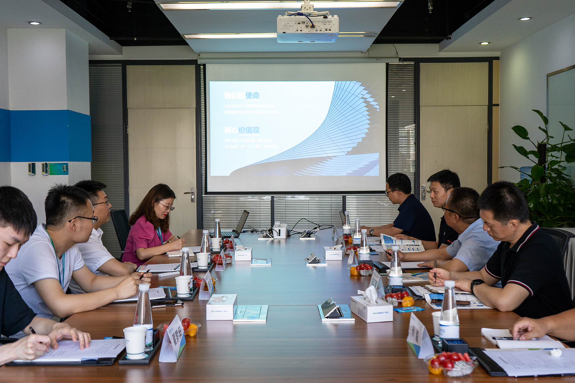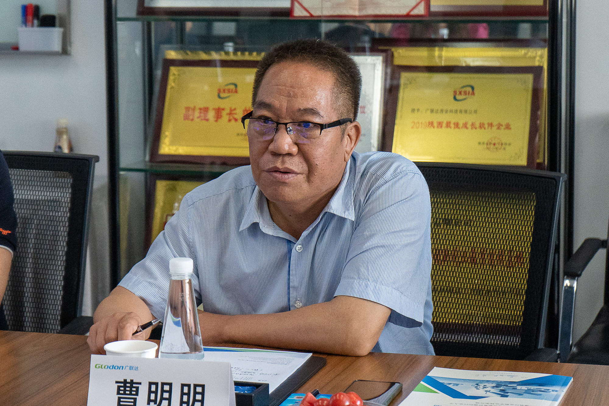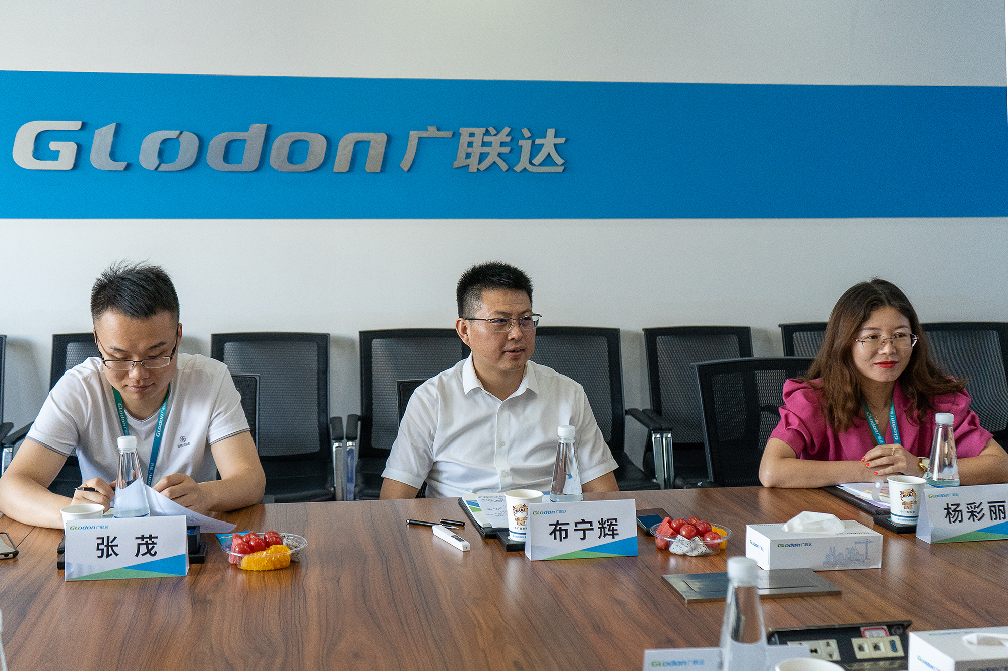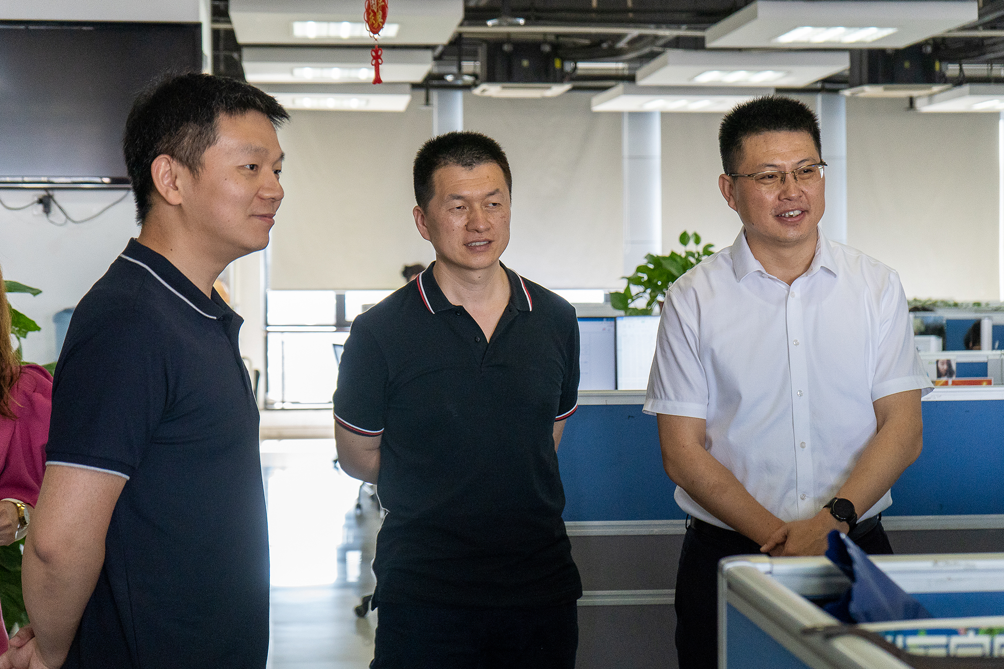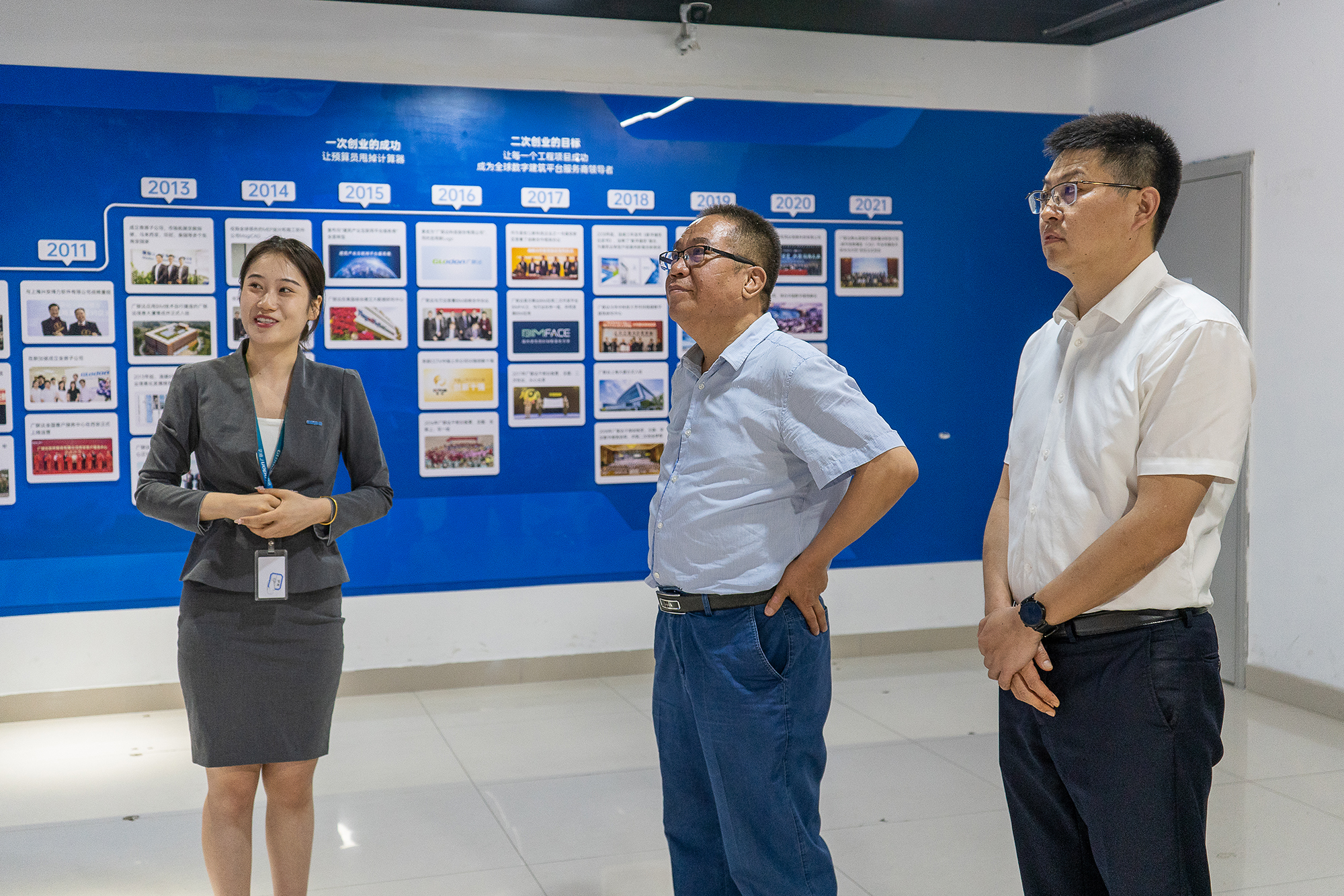 在广联达展厅,曹明明一行听取广联达集团发展历程、战略发展定位、产业基本情况介绍,在广联达助理总裁布宁辉的陪同下参观了集团研发中心、数字服务中心等地。