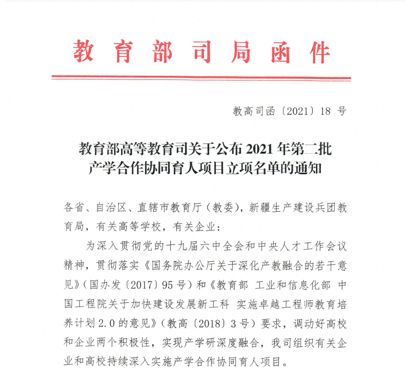产学合作协同育人项目旨在通过政府搭台、企业支持、高校对接、共建共享,深化产教融合,促进教育链、人才链与产业链、创新链有机衔接,以产业和技术发展的最新需求推动高校人才培养改革。
