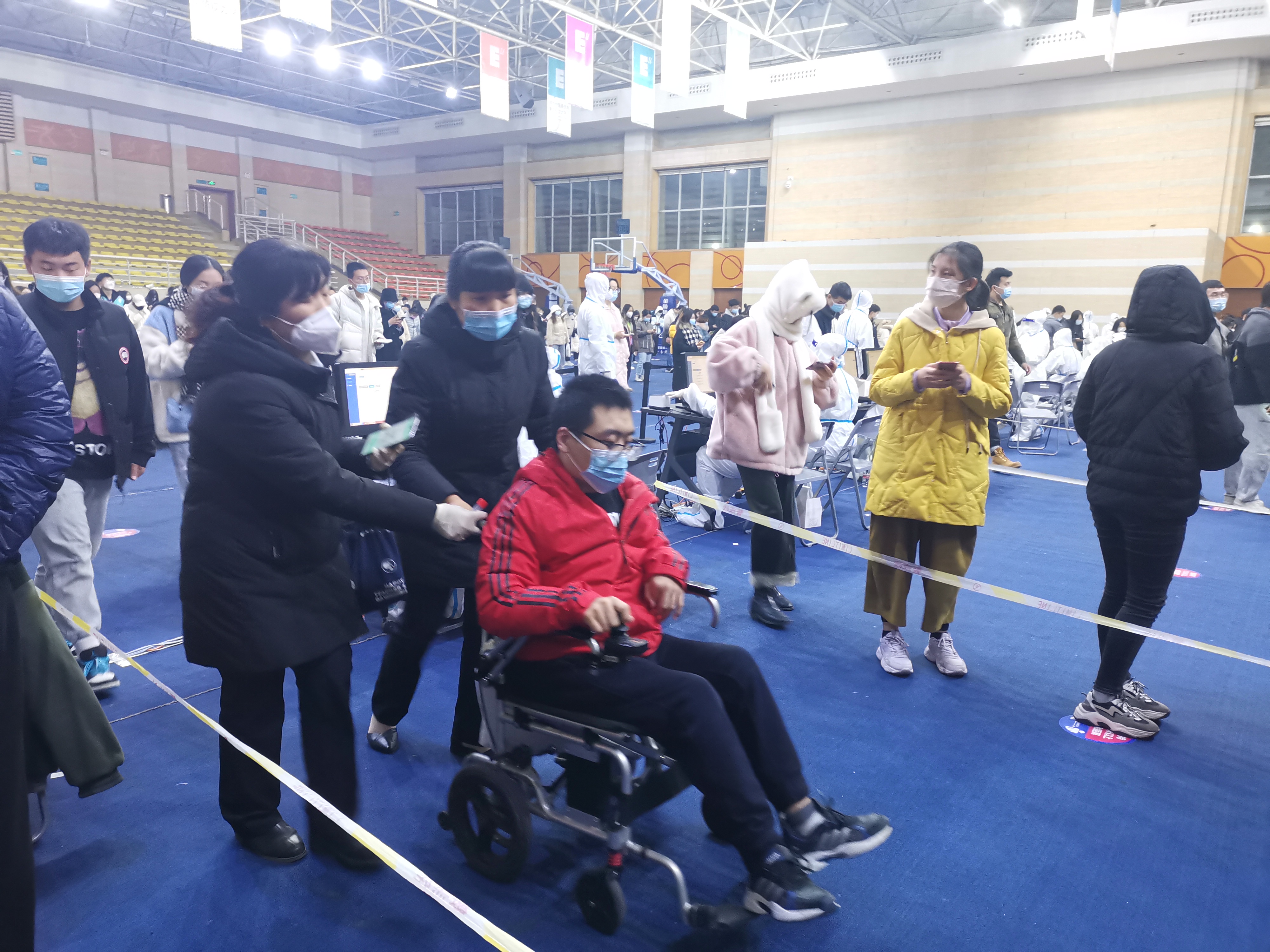 同时,在核酸检测工作中,后勤集团持续践行以“以客户为中心”的服务理念。我们为行动不便的同学开辟了“绿色通道”,并安排专人全程陪同,为学生解决实际问题,尽最大努力去便利每一个人。