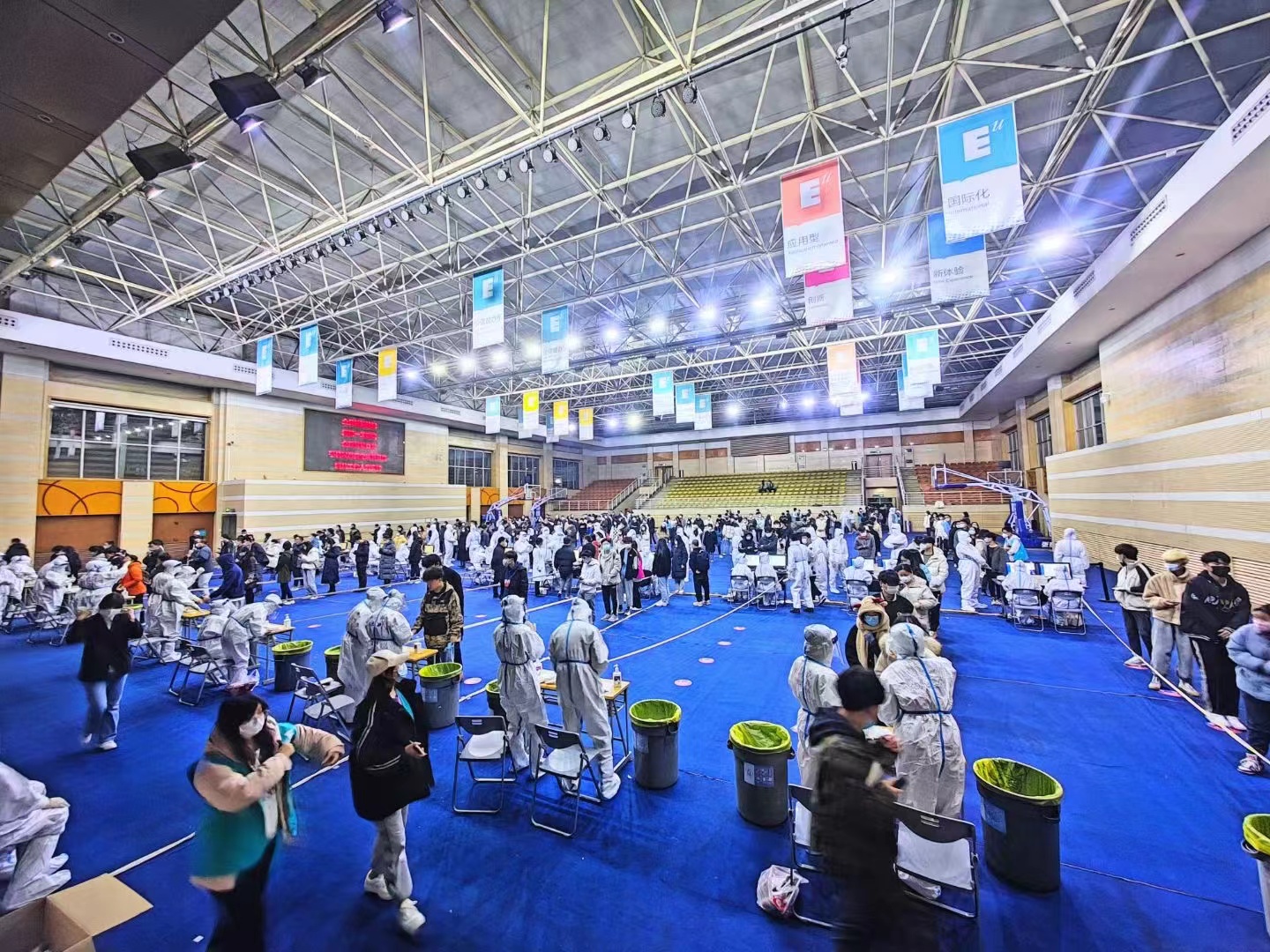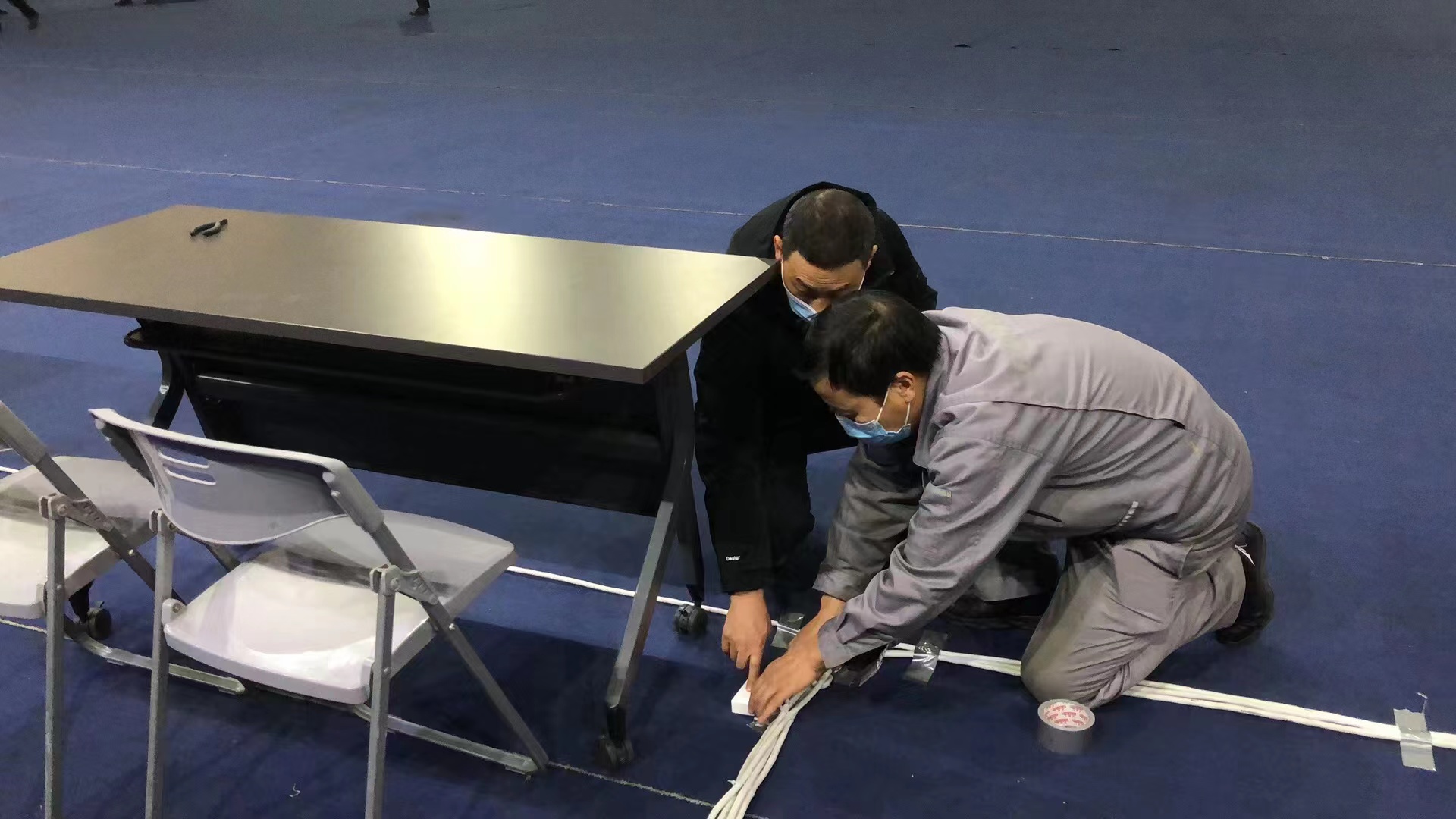 时间紧、任务重。为保障此项工作顺利开展,后勤集团立即组织人员,集团管理层亲临现场,带队开展现场布设工作。搬桌椅、铺线路、接设备……全力保障全员核酸检测工作顺利开展!