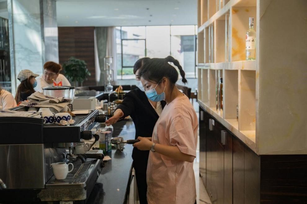 接着到了酒店大堂吧—灵水吧,酒店特别安排了同学们的体验环节。漂亮的小姐姐演示了现磨咖啡的制作,随后范舒欣同学在工作人员的帮助下体验了制作卡布奇诺咖啡。咖啡拉花虽然不完美,相信对于范舒欣同学来说,那杯咖啡的味道是独一无二的。