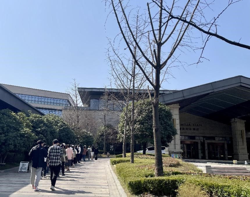 21级文化休闲服务系学生,坐着学校的校车,统一前往盛美利亚酒店。酒店位于西安曲江新区,融合西班牙的奢华前卫与中国的东方风韵。