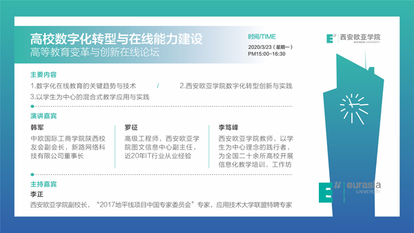 首期论坛由我校副校长李正主持。论坛聚焦“高校数字化转型”话题,围绕数字化在线教育的关键趋势与技术、西安欧亚学院数字化转型创新与实践、以学生为中心的混合式教学应用与实践等具体内容展开在线交流与分享。