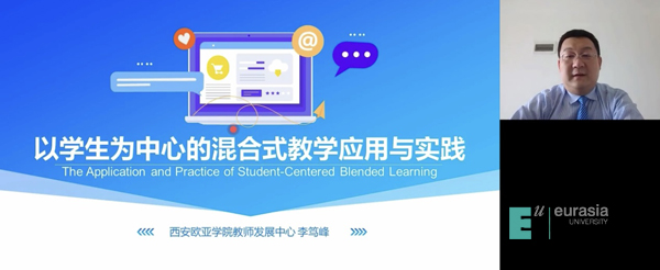 我校教师发展中心培训师李笃峰是“以学生为中心”教学理念的积极践行者,他已经为全国三十余所高校开展了信息化教学培训和工作坊。他从一线教师的视角,结合自己的授课课程,分享了在欧亚数字化教学环境和平台上,如何开展以学生为中心的混合式教学,呈现具体的应用模式、应用场景和丰富的混合式教学实践方法。