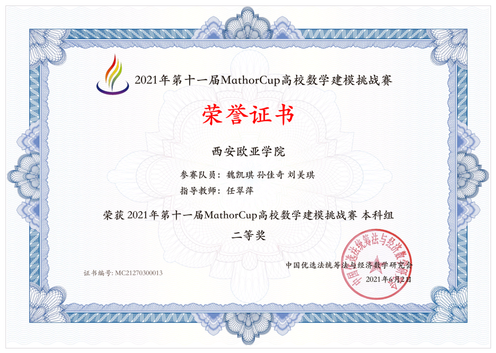第十一届MathorCup高校数学建模挑战赛于2021年6月4日公示获奖名单,西安欧亚学院金融分院共有7支队伍参加竞赛,都来自数据科学与大数据技术专业在四位老师的带队下,七支队伍中有四支队伍荣获全国二等奖,两支队伍荣获全国三等奖,取得优异成绩。