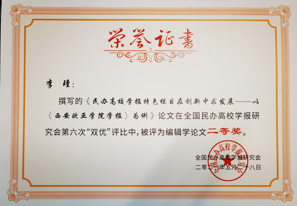 5月28日,二届三次全国民办高校学报工作研讨会在杭州举行。由我校编辑出版的《西安欧亚学院教育研究》在全国民办高校学报第六次“双优”评比中荣获全国民办高校学报“十佳期刊”称号。编辑部李瑾同志的编辑学论文《民办高校学报特色栏目在创新中求发展》荣获二等奖。