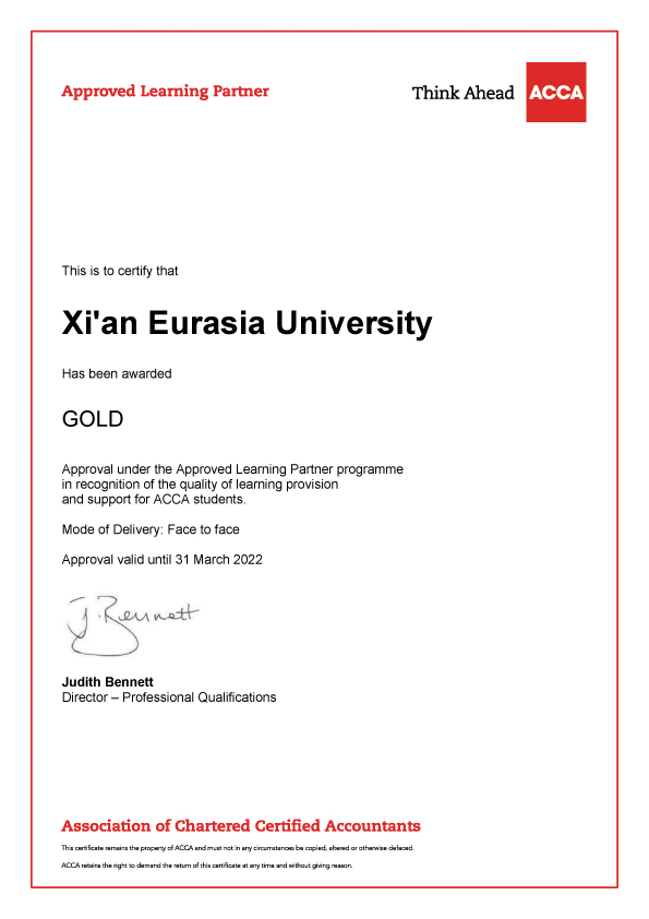 黄金级认可教育机构资质认证是ACCA官方对优质教育机构的正式认可,获得该资质认证,意味着我校加入了全球最佳ACCA教育机构之列,已获得ACCA黄金级教育学习合作伙伴的认可!同时认可我校的教学与学习质量以及为ACCA学生所提供的支持!ACCA英国总部和ACCA中国各办公室后期会向有意愿参加ACCA学习的学生郑重推荐我校“ACCA黄金级认可教育机构”资质,此举意味着在推动我校在地国际化教学管理更上新台阶的同时,也使我校商科国际化教育质量有了更高的社会公认度!