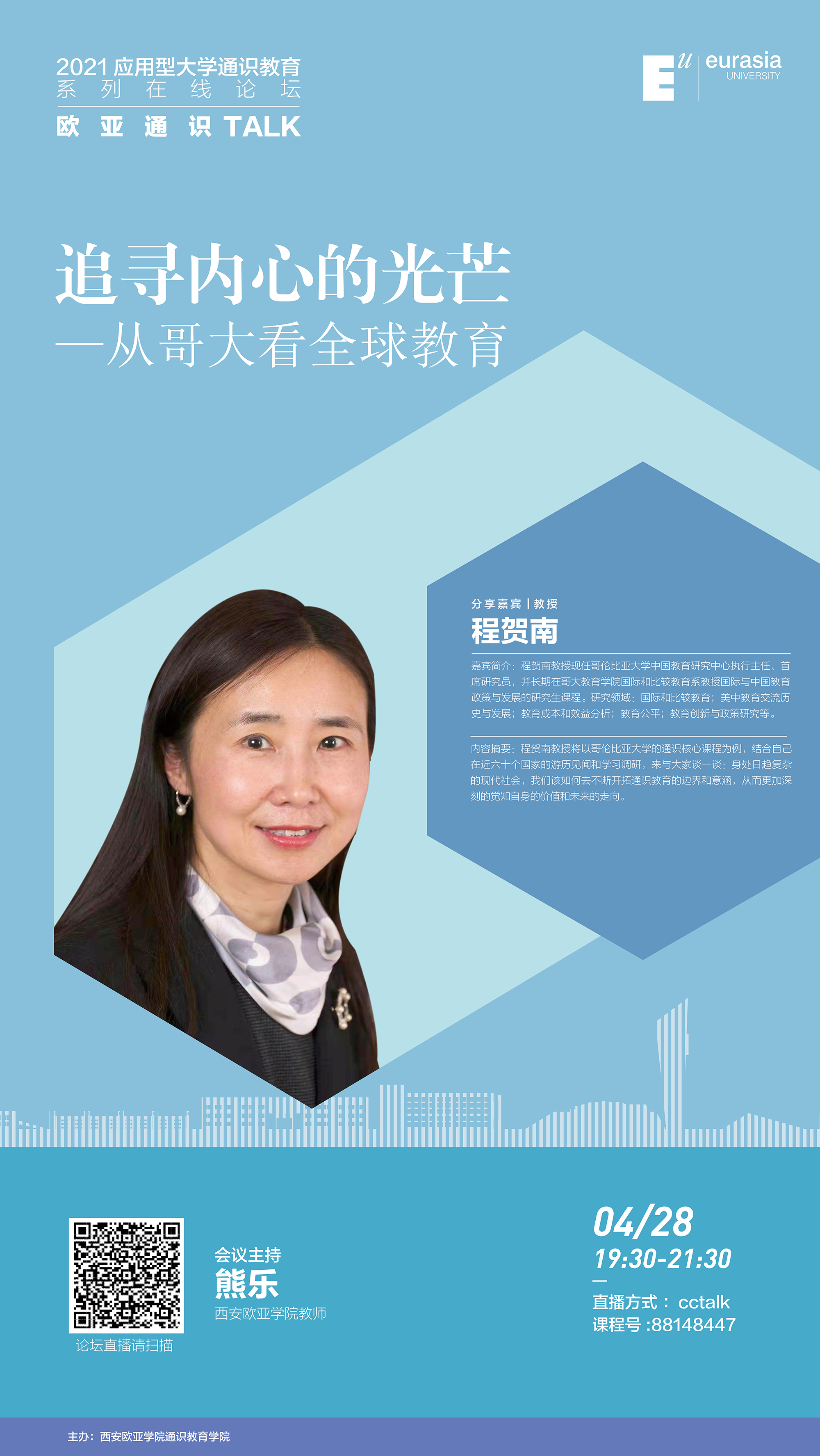 美国哥伦比亚大学的通识教育课程体系,自建立至今已逾一百周年。他们在通识教育领域的大胆实践,被认为是美国现代大学通识教育的起点,其所构建的通识教育体系早已蜚声世界,引得众多名校竞相效仿。本次论坛,我们邀请到哥伦比亚大学中国教育研究中心执行主任程贺南教授,她将以哥伦比亚大学的通识核心课程为例,结合自己在近六十个国家的游历见闻和学习调研,来与大家谈一谈:身处日趋复杂的现代社会,我们该如何去不断开拓通识教育的边界和意涵,从而更加深刻的觉知自身的价值和未来的走向。
