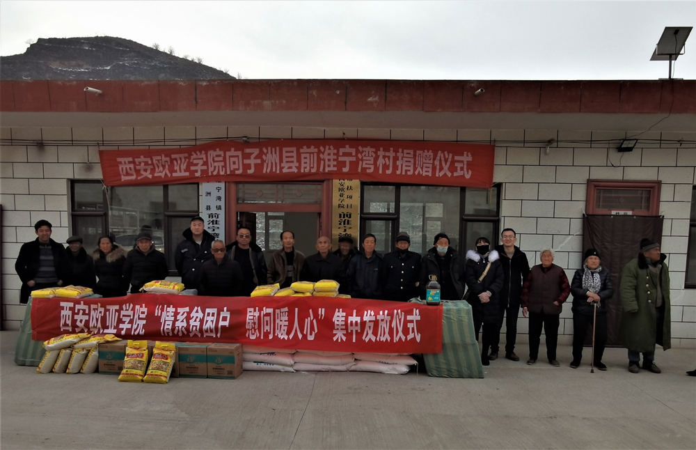 1月22日上午,我校驻村工作队依照学校安排,在子洲县淮宁湾镇前淮宁湾村村委会院内举行了简单又温馨的“情系贫困户、慰问暖人心”节前慰问发放仪式,向20户困难家庭每户送去一袋米一袋面一桶油,带去全校2万多师生的关心和问候,祝福他们过一个温馨的春节。独居老人王玉周感激地说:学校每年过年都惦记着我们,让我们在寒冷的冬天随时都能感受到政府和学校的温暖,感谢党和政府的领导,感谢西安欧亚学院两万多名师生对我们困难群众的关怀,期盼西安欧亚学院越办越好!
