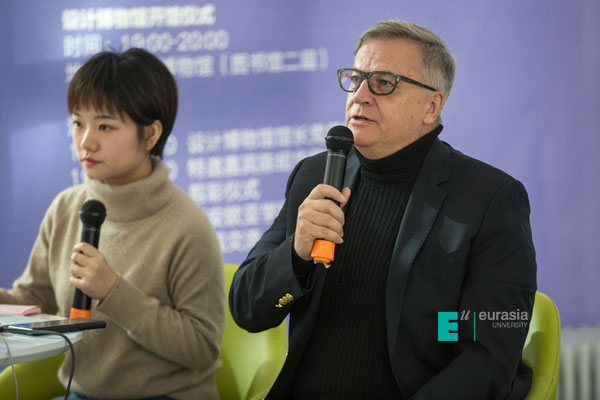 当天活动现场,Tony Brown,我校无人机影像工作室技术负责人卫易东,著名建筑师、设计师、艺术策展人吴迪等中外三位大咖为欧亚师生们带来对设计与传媒的深刻理解与思考。