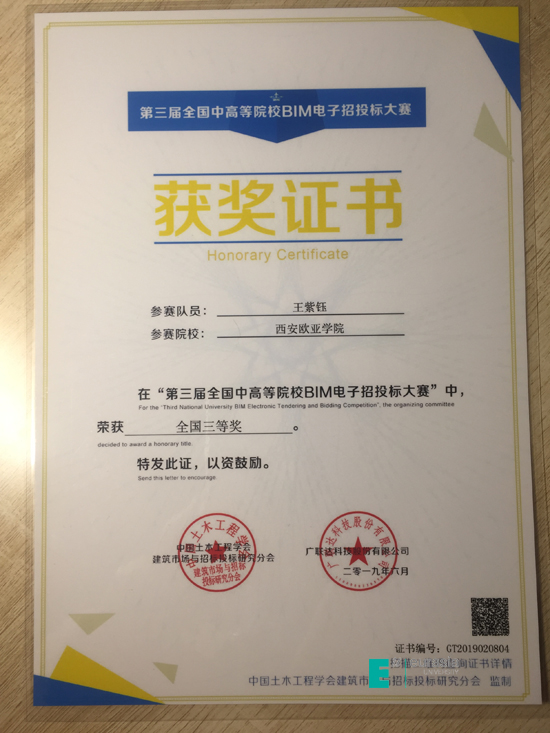 2019年6月,我和伙伴们荣获第三届全国中高等院校BIM电子招投标大赛全国三等奖。真的很感谢工作室的赵敏老师、张磊老师对我的帮助与支持。可能有些竞赛在日后的生活或者学习当中看似不起眼,实际上,无论是什么样的竞赛,都会对我产生极大的影响,这也是我考研道路上的一枚扣响世界名校的“通行证”之一。