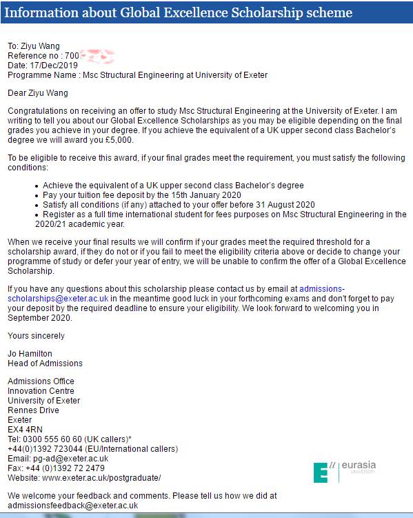 奖学金:University of Exeter埃克赛特大学,全球卓越计划奖学金( 5000英镑)