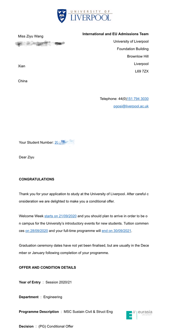 录取院校:University of Liverpool利物浦大学(全球排名第181)