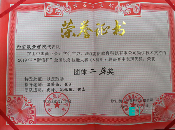 (图一)2019“衡信杯”全国税务技能大赛二等奖证书