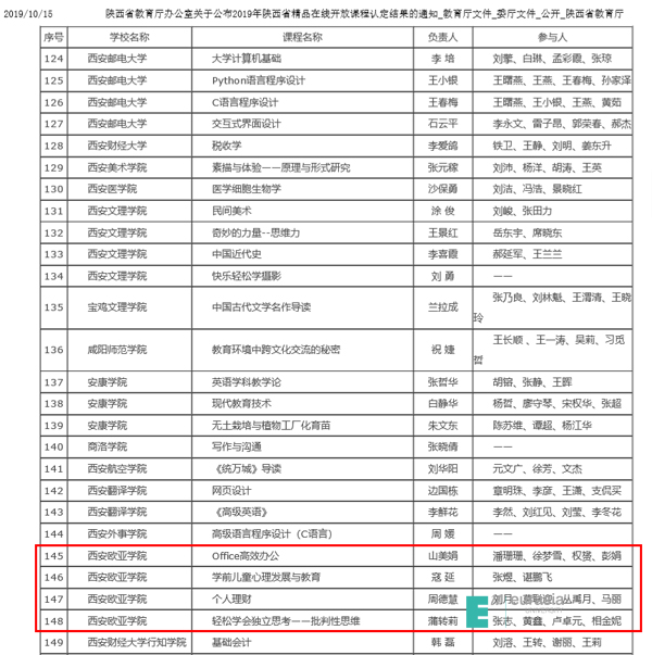 近日,认定结果在陕西省教育厅官网公布,我校推荐的4门课程均被认定为“2019年陕西省精品在线开放课程”,认定率100%,亦为同类院校认定数量最多的院校。