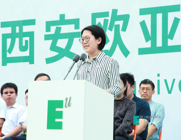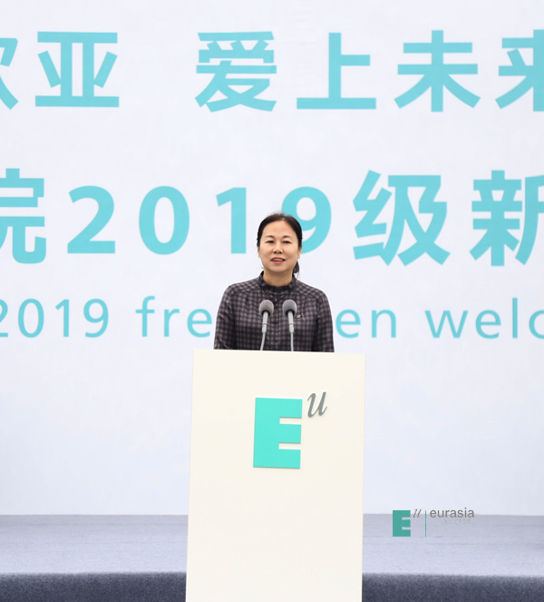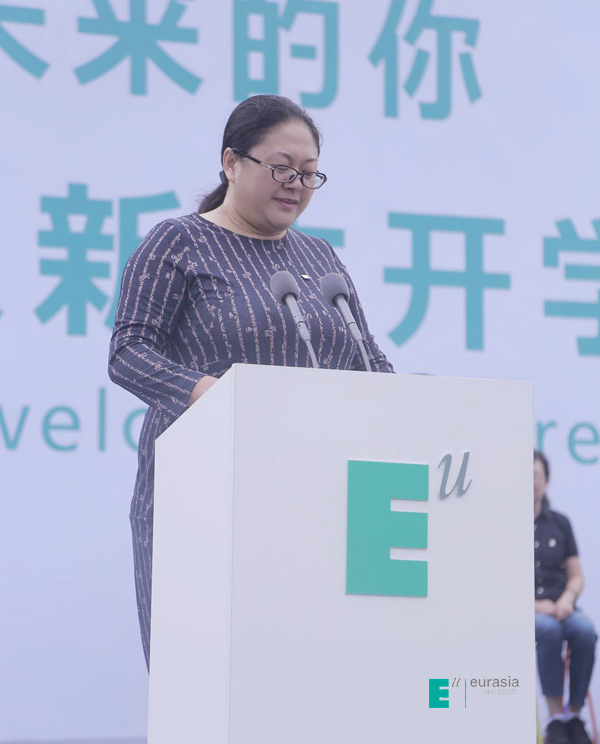 接下来,我校校长刘瑾教授致欢迎词。她说:“欧亚所做的一切,是为了满足师生们的多元化需求,让大家感到方便、自在和舒心。但更重要的是,我们希望通过这些努力,让师生们感受到一种对美和品质的追求。我们相信,高质量的生活体验是卓越教育的一部分。好的审美情趣和生活习惯,从容淡定的气质与优雅自信的谈吐,来自于对美和品质的感知和体验。在欧亚,我们崇尚“教育即生活”,要把美和高品质的生活体验带给大家,而这些新体验将影响你们的一生。学校最新落成的国际语言学习中心,为学生提供完备的全球化、多品类英语教育项目和课程,能够满足同学们多层次的学习需求。国际商学院独特的课程内容、录取模式和奖学金配置,使国际化教育不再遥不可及。只要你足够优秀,欧亚会及时为你们搭建通往世界的桥梁。欧亚地处西安,却心怀世界。国际化战略的持续落地,将会让国际教育交流合作的成果真正惠及所有师生,培养重品格、会思考,善沟通,具有国际视野、创新精神和较强实践能力的世界公民。希望同学们在欧亚学会合作、懂得奉献、重视体验、关注成长,同时要学会对人关爱、做事讲究。我衷心祝愿,欧亚能让你们的青春年华绽放出灿烂的光辉,欧亚的教育能够成就每一位同学的人生梦想。”
