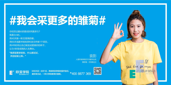 几则故事诠释了欧亚,几个人物代表了欧亚人。欧亚的大学生活,满足你对梦想的所有想象。穿越时光,你会看到未来三四年后的自己——你在通宵自习室里备战考研;你在英国或美国的常春藤大学游学或进修;你拿到了心仪已久的企业OFFER;你策划了每年一度的春季运动会;你懂得装扮自己也能欣赏一场艺术展览;你不盲从大流,更遵循自己内心的价值观;你收获了友情,或是爱情。由此出发,大学如此多彩,开启在欧亚的每一天;由此开始,给梦想更多可能,带着欧亚的DNA追梦前行吧!
