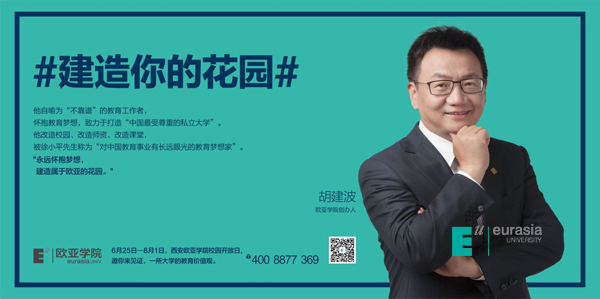 西安欧亚学院成立于1995年,是一所以管理、经济为主,艺术、文学、教育、工学等协调发展的国际化应用型普通本科高校。作为深受欧亚学子们喜爱的“老胡”——校长胡建波,也作为了展牌的追梦“欧亚人”,分享了自己的故事和感想。他自喻为“不靠谱”的教育工作者,怀抱教育梦想,致力打造“中国最受尊重的私立大学”。他改造校园、改造师资、改造课堂,被徐小平先生成为“对中国教育事业有长远眼光的教育梦想家”。