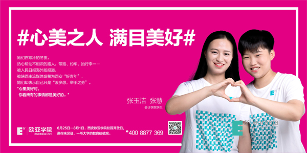 西安欧亚学院致力培养向美而生的学生,而心美之人,满目美好。改变自己,最重要的一件事就是让自己的内心变得始终阳光、积极、美好,当你心里美好时,你看所有的事情都是美好的,你会觉得整个社会都是美好的,你离真正的人生成功便不远了。而欧亚人正带着向美的DNA鼓励着自己,回馈着社会。