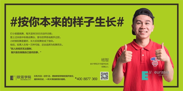 “如果人生有一万种可能,我还会选择为街舞而生。别人的经历无法复制,我只是在做我自己喜欢的事”这句西安欧亚学院会计学院2018届毕业生杨智的独白,可能会让所有人羡慕不已。他从小热爱跳舞,每天坚持3000此的动作训练。他登上过央视中秋晚会的舞台, 曾经与世界各地的高手过招。这样一个少年,也用着他青春的朝气和追梦的故事,告诉我们梦想和现实可以共存。