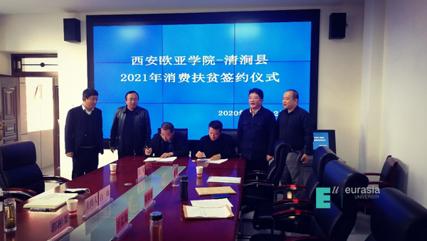 我校工会副主席晏建忠代表学校与清涧县人民政府副县长郭彬荣签订了《我校2020.9---2021.9优质农产品战略框架合作协议》。随后,郭彬荣副县长代表清涧县对我校2020年教育帮扶工作给与了高度肯定,认为学校能够发挥教育培训优势,为清涧县智力帮扶、教育帮扶贡献了力量、取得了成绩;新的一年,希望发挥学校师生多的优势,继续加大消费扶贫力度,让清涧县优质农产品通过学校广大师生传播出去,让更多的人知道、了解和购买清涧县的优质农产品,为清涧县美丽乡村建设做出新的贡献。