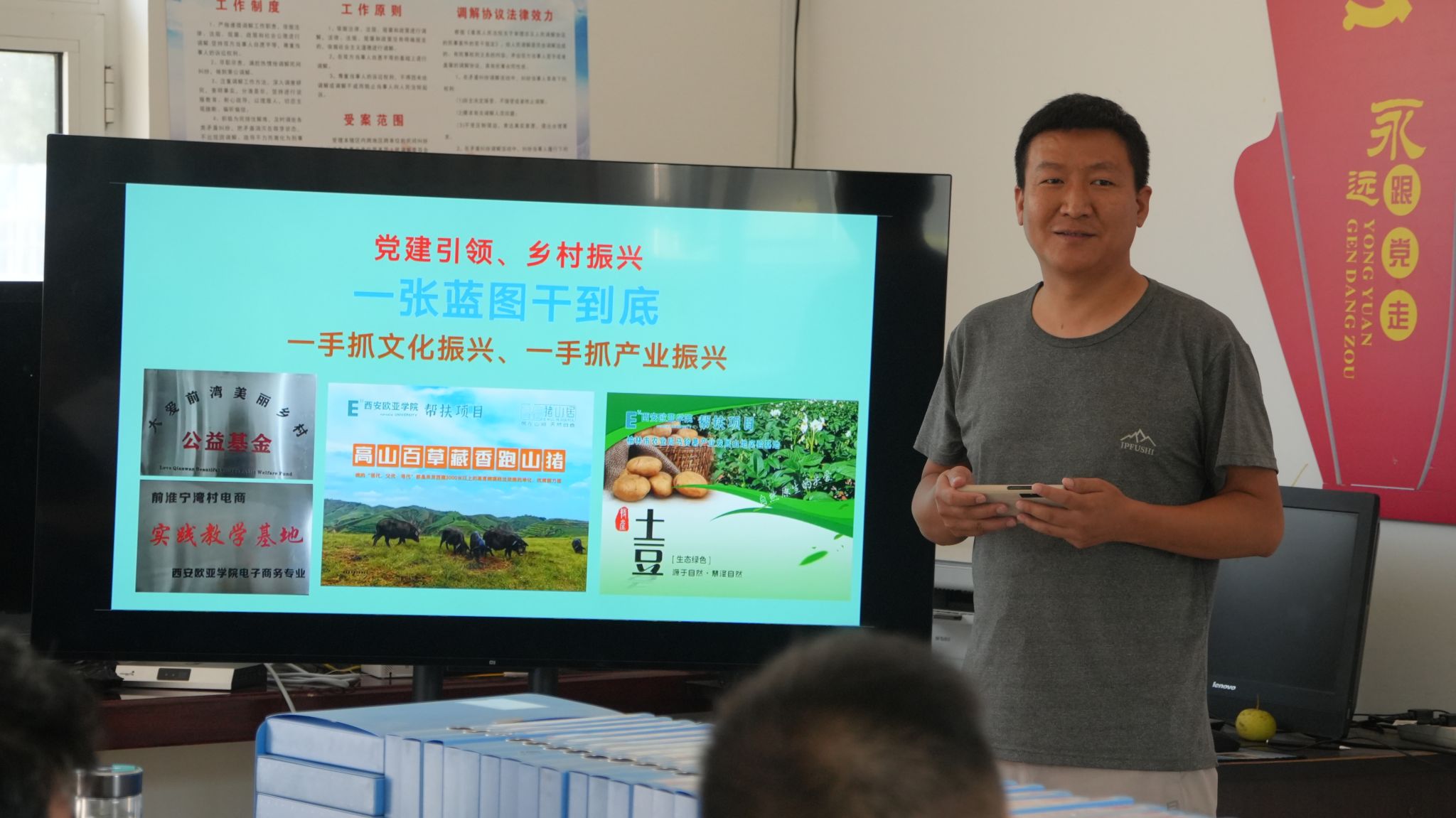 学校驻村工作队队长马波汇报了前淮宁湾村文化振兴(“大爱前湾,美丽乡村”公益基金,关爱留守儿童和留守老人、贫困家庭;活跃乡村文化)和产业振兴(高山土豆和藏香猪养殖场项目)、庭院经济、电商运营等工作落地情况,下半年,学校驻村工作将按照“三个做好,三个持续,三个协调”有序推进,为子洲县乡村振兴和帮扶村集体经济高质量发展贡献欧亚智慧。