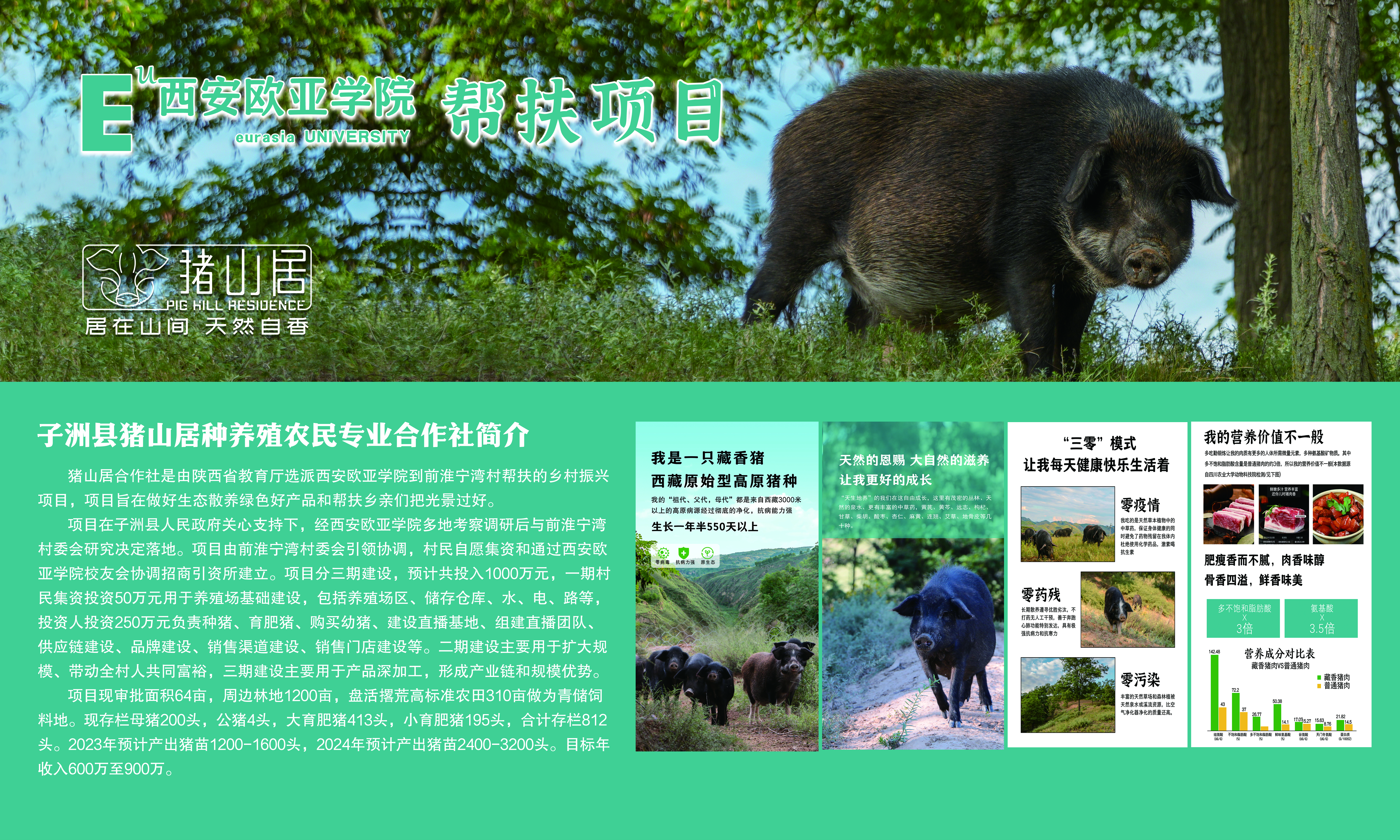 藏香猪一期项目获批占地面积64亩,可用林地1200亩,青储饲料用地310亩。购买母猪200头、公猪4头、育肥猪413头、小育肥猪195头,2024年预计产出猪仔1500头、年收入500万以上。