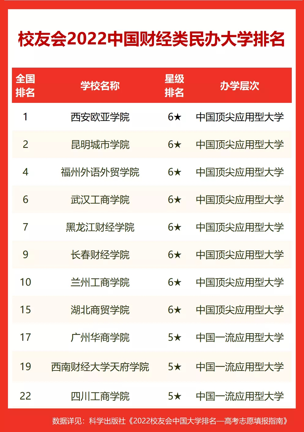 2022年1月25日,全国第三方大学评价机构艾瑞深中国校友会网正式发布《2022校友会中国大学排名——高考志愿填报指南》。西安欧亚学院凭借高质量办学连续9年位列中国校友会网“财经类民办大学排行榜”榜首。