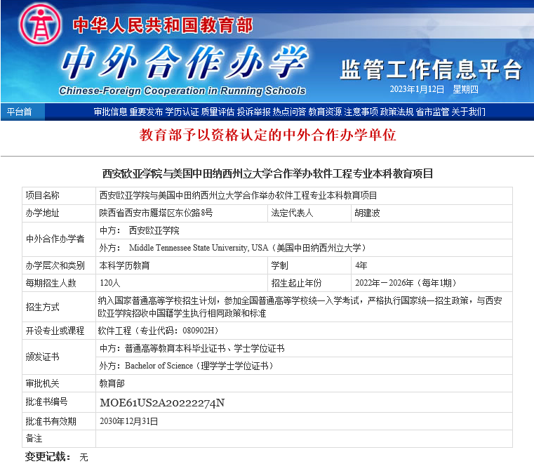 2022年4月26日,教育部公布2021年下半年中外合作办学项目审批结果,西安欧亚学院与美国中田纳西州立大学合作举办的软件工程专业本科教育项目成功获批。此次获批的中美合作项目为学校首个中外合作办学项目,进一步丰富了学校国际化项目的办学类型,是学校深入推进“在地国际化”战略发展的重要里程碑。9月,114名软件工程专业中外合作班学生开启了在欧亚的国际化学习之旅。目前,学校国际项目已覆盖全部9个二级学院,共4大类型、18个学科项目。学校将以软件工程专业中外合作办学项目为契机,探索与深化国际化在其他学科专业发展上更多的形式与可能,惠及更广泛的学生。
