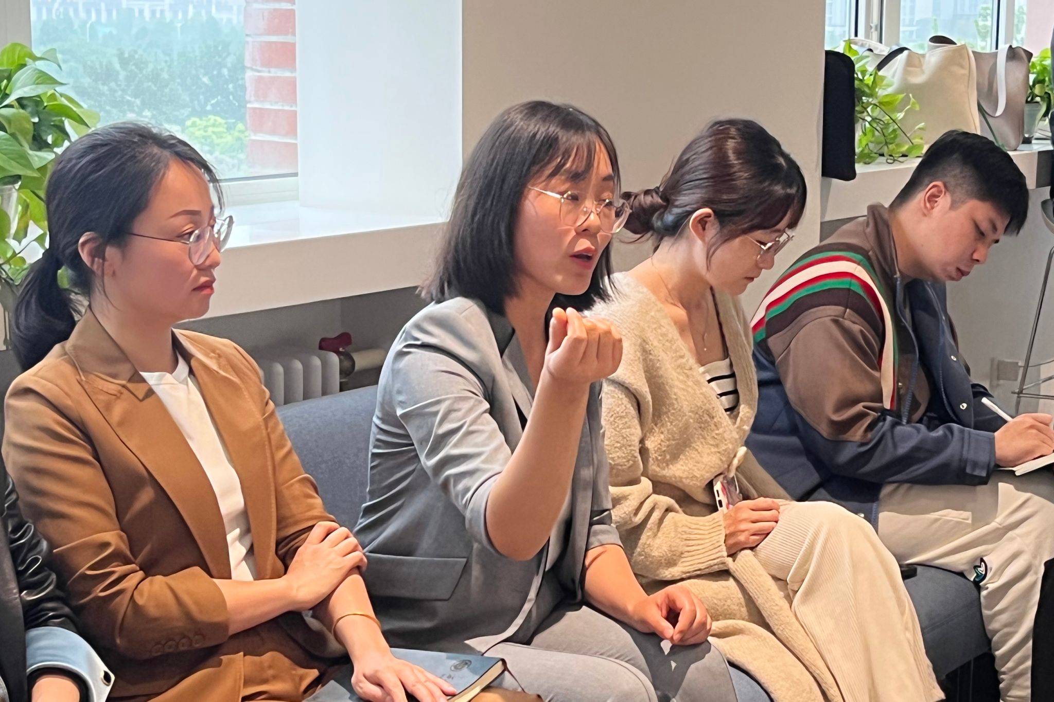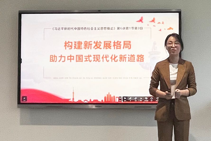 吴昕老师承担的是《习近平新时代中国特色社会主义思想概论》《毛泽东思想和中国特色社会主义思想体系概论》等课程的教学。她在“构建新发展格局”主题教学展示中,开篇通过提问引发大家思考,继而娓娓道来。概念讲解与照片展示相结合,讲述照片背后的思想产生背景。过程中,吴昕老师每每通过身体动作和手势,对课件作精细划重点式解读,让学生能够看到课件,看清课件,看懂课件。纪录片《行进中的中国——经济篇》中的片段,让课程由理论过渡到实际,将听众从坝上草原带到奶粉生产线,在镜头的切换中,学生由中国奶业看到了中国“经济循环畅通”“高水平自立自强”。结尾,吴昕老师由学生聊天提及的就业难问题,引导学生思考将个人发展结合国家发展,将一堂理论性极强的课程化作了学生的身边事,润物细无声,细节见功夫。在互动交流中,吴昕老师分享了“以本为本,找到创新点”的自我求索历程。她说,要有自己的风格,不能千人一面;要搭建自己的讲授逻辑线,再吸纳他人建议,自我迭代,反复研磨。另外,好的思政课程设计一定要能解答同学们心中最真实的疑惑,让同学们觉得有用、有价值,才能避免形式主义,真正落实好意识形态教育工作。