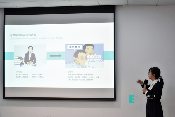在沙龙上第一位分享的老师是来自孔子青年社区的辅导员王焱。她从新员工的角度谈了辅导员工作“24小时全天候”“365天全力以赴”对她意识上带来的冲击,以及自己是如何调整面对的。王焱老师说:“经过了一系列看似不可能完成的任务,我确认我在欧亚遇见了全新的自己,感谢这一段富有挑战的旅程。”