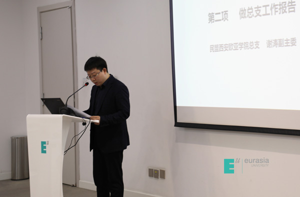 大会由民盟西安欧亚学院总支赵颖副主委主持。会议第一项,由谢涛副主委作总支工作报告。工作总结分为 “过去工作的回顾”及“今后工作的思路”两部分。在民盟陕西省委、西安欧亚学院党委的正确领导与指导帮助下,民盟西安欧亚学院总支提高站位,注重加强自身建设,提高整体素质,在坚决履职方面,发挥了积极的作用。反思工作不足,谢涛副主委提出了总支在组织发展、参政议政、社会服务三个方面存在的不足,明确总支今后的工作思路主要围绕四个方面展开,一是加强思想建设,凝聚思想政治共识;二是重视组织发展,壮大基层组织队伍;三是关注民生热点,积极开展参政议政;四是发挥自身优势,做实思想宣传工作。谢涛副主委强调,应聚焦思想政治建设、组织建设、履职能力建设,针对总支社会服务能力、盟务工作思想宣传的短板,明确盟务工作下一阶段发展目标,持续为陕盟在全国发声继续努力!