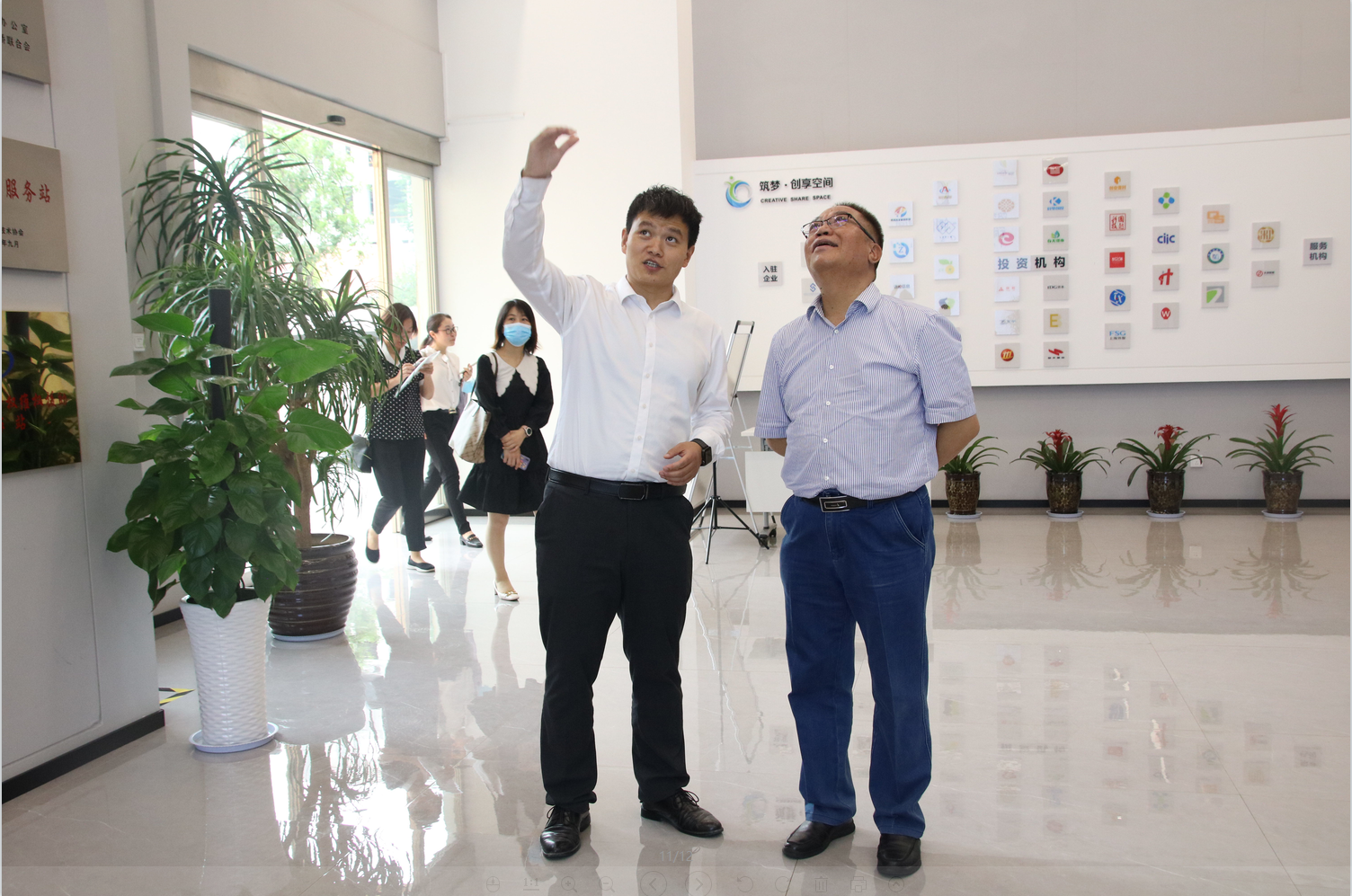 (图一)沈洋副局长和曹明明副校长听取众创空间介绍