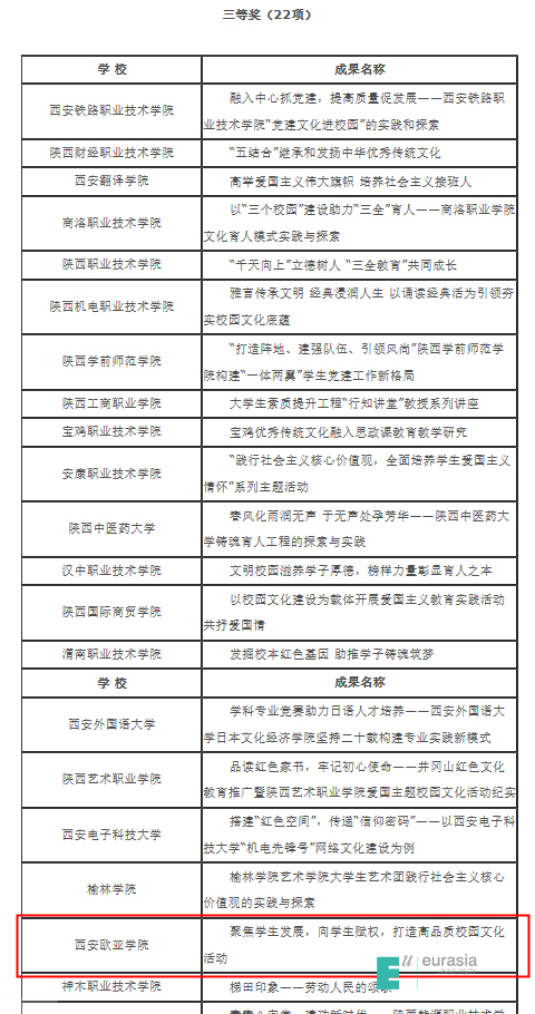 近期,省委教育工委印发了《关于表彰2019年全省高校校园文化建设优秀成果的通报》(陕教工〔2020〕15号),对全省2019年度高校校园文化建设优秀成果进行了通报表彰。我校申报的《聚焦学生发展,向学生赋权,打造高品质校园文化活动》项目荣获三等奖。