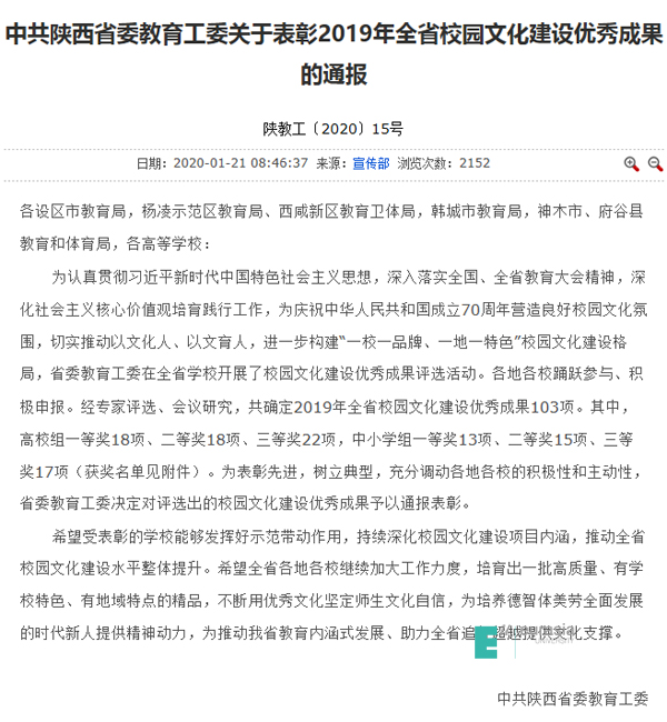 据了解,为庆祝中华人民共和国成立70周年营造良好校园文化氛围,切实推动以文化人、以文育人,进一步构建“一校一品牌、一地一特色”校园文化建设格局,陕西省委教育工委在全省学校开展了校园文化建设优秀成果评选活动。经专家评选、会议研究,共确定2019年全省校园文化建设优秀成果103项。其中,高校组一等奖18项、二等奖18项、三等奖22项。