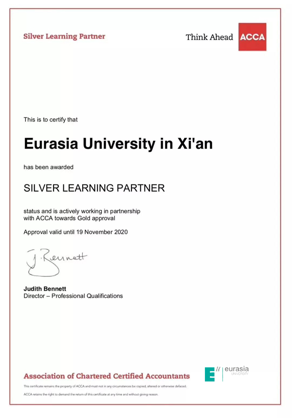 “ACCA白银级教育机构”认证证书