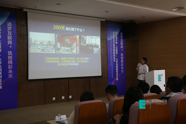 《臻一刀画》作为第四届大赛校赛金奖项目并已入驻Eu-start孵化器,该项目团队负责人骆艺雯在启动仪式上进行了精彩的路演展示,为我校学生今年参赛树立了学习标杆。