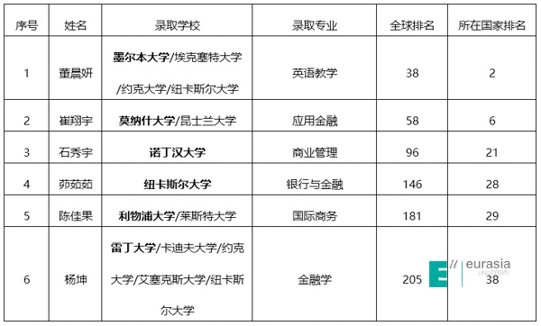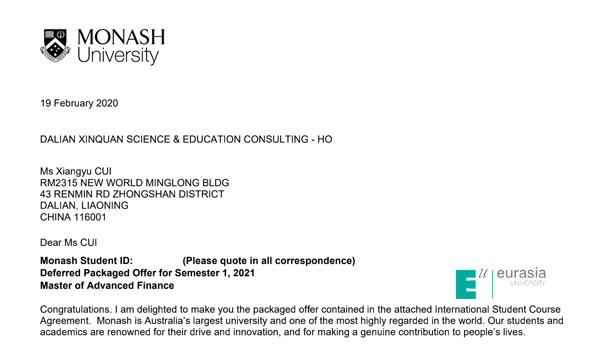 三月,我校金融学院的老师和同学们虽然因为疫情不能在一起,但六位同学被海外一流院校录取的好消息令大家无比振奋。金融学院CFA特色班的崔翔宇、陈佳果、杨坤、茆茹茹及董晨妍、石秀宇六位同学分别收到了全球排名TOP100的墨尔本大学、诺丁汉大学、莫纳什大学;全球排名TOP200的利物浦大学、纽卡斯尔大学和雷丁大学的录取通知书。她们以努力的姿态,不负青春好时光,她们用大学四年的努力换来明日的更加从容!