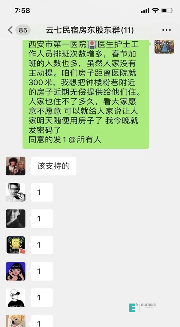 除此之外,张靖炜了解到,西安市第一医院的医护人员春节期间都在加班开展防“疫”工作,因政府加强对出行的管控,给那些离家远、轮班频次高的医护人员带来极大不便。为了给这些加班加点的医护人员提供一个安全、方便、温暖的住所,张靖炜联系到周边民宿房东,利用房源的位置优势,自愿为西安市第一医院的医护人员提供干净、独立的免费房源。他说:“医护人员是守护我们的天使,这一次,让我们也来守护他们”。