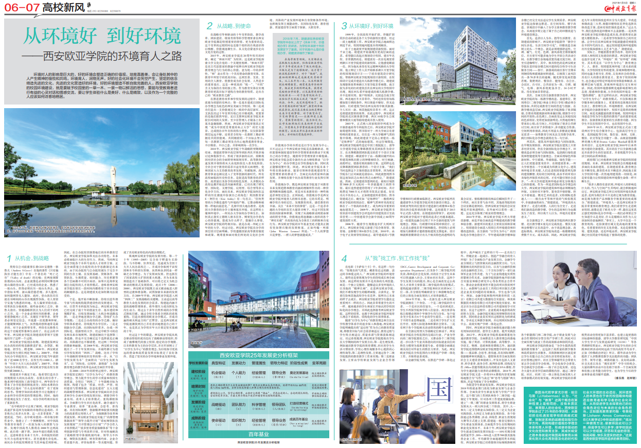 《中国教育报》2021年1月5日刊发的《从环境好,到好环境》一文,从战略选择与实施、校园环境建设服务教育教学改革等角度报道了我校的环境育人之路。文章指出,回顾西安欧亚学院走过的25年办学历程,从最初抓住机遇实现学校的跨越式发展,到制定系统的战略规划指引办学方向,再到构建价值观办学理念体系和育人环境,形成使命驱动的文化自觉和教育主张,其成长蜕变之路本身就是对我国高等教育从精英化到大众化再到普及化的时代和社会大环境的主动适应,其环境育人的本质也在于依托校园载体构建适应教育者和学习者的社会化环境,从而促进学生去探索自己的社会角色定位与未来的社会角色担当。