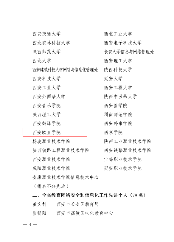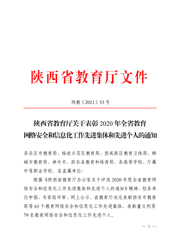 2020年底,陕西省教育厅主办了面向全省的教育信息化先进集体与个人评选活动,旨在表彰对全省教育信息化做出突出贡献的集体及个人,经过各单位的申报、专家组评审、网上公示等环节,我校荣获“陕西省教育信息化工作先进集体”荣誉称号,同时,我校图文信息中心郝彩娟老师获得“陕西省教育信息化工作先进个人”荣誉称号。