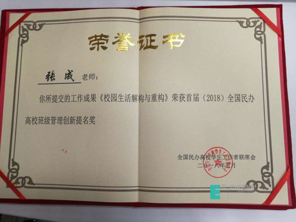 (图一)全国民办高校班级管理创新提名奖荣誉证书
