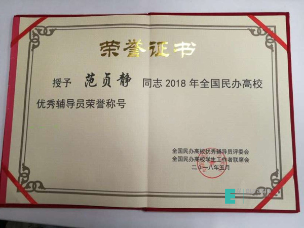(图二)全国民办高校优秀辅导员获奖证书