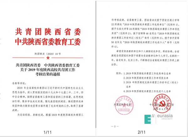 近日,共青团陕西省委、中共陕西省委教育工委联合下发了《关于2019年度陕西高校共青团工作考核结果的通报》(陕团联发〔2020〕10号),我校团委获得“陕西高校共青团大学生社会实践与志愿服务工作先进单位”,我校校长刘瑾教授荣获“2019年陕西高校支持共青团工作好校长”称号。
