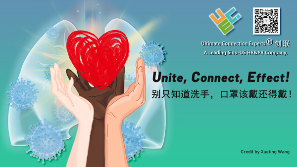 雪婷:“甲方设计需求是希望通过海报表现出全球各地人民互帮互助,一定会战胜疫情的信心。根据这个要求,首先我调研了一些美国的人种文化,调研了一些受欢迎的广告设计风格,构思了四个设计方案的草图,都是围绕着互帮互助的主题,考虑到多种族、多样化的展示氛围,最后选用了三只不同肤色的手共同托起爱心的方案。在背景色调上,我选择了简洁又明亮的渐变色,希望给人带来希望的感觉。英文使用较粗的无衬线字体,为了适应美国广告展示字体的统一;中文配合使用了比较常规的字体,更简单明了一些。最后在作品中我签署了自己的名字作为版权,当时真的感觉到非常自豪。”