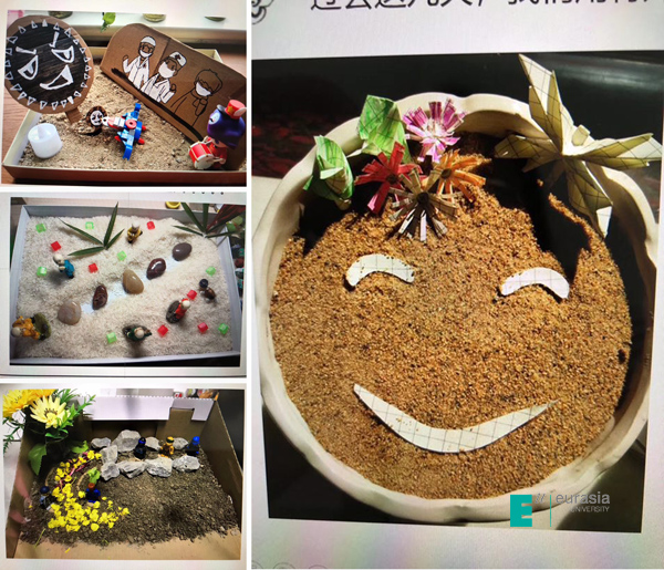 我校人文教育学院的《箱庭疗法》课程,结合当前“全国抗击疫情”的主题,授课老师和同学们就地取材,创作了这些“特殊的箱庭”,向抗击在疫情一线的人们表达慰问,向更多的人传递希望和力量。