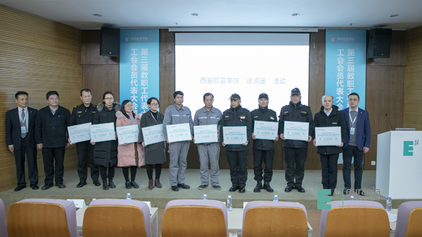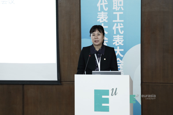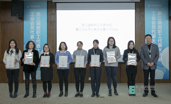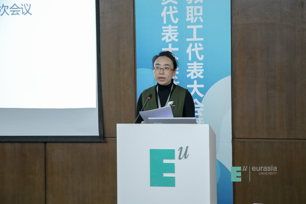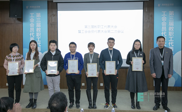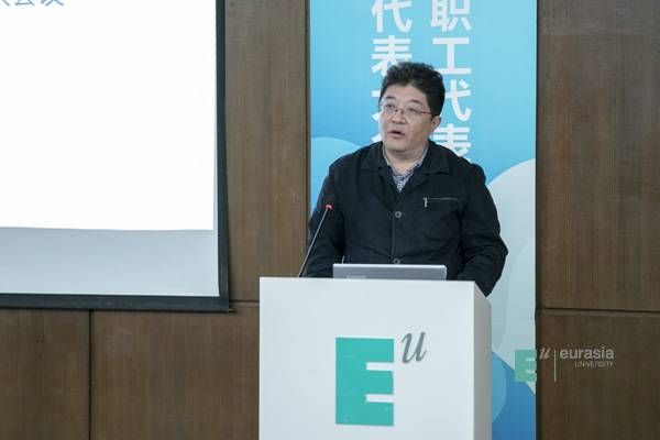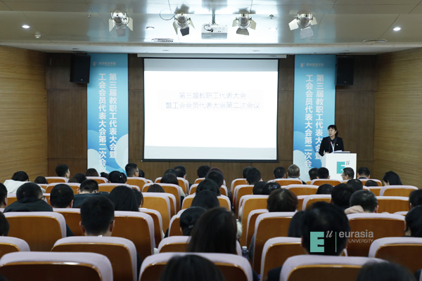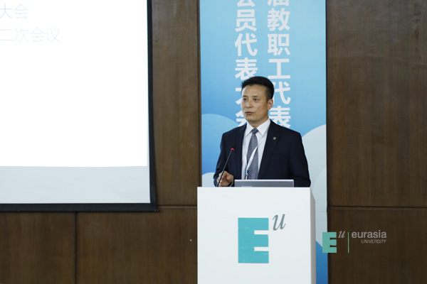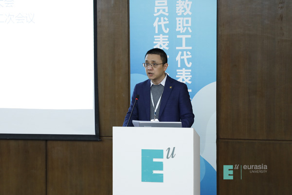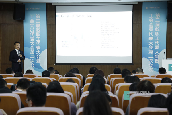 工会副主席晏建忠作《西安欧亚学院第三届一次工会工作报告》以及《第三届一次教代会提案处理情况报告》和《第三届二次教代会提案征集情况报告》。