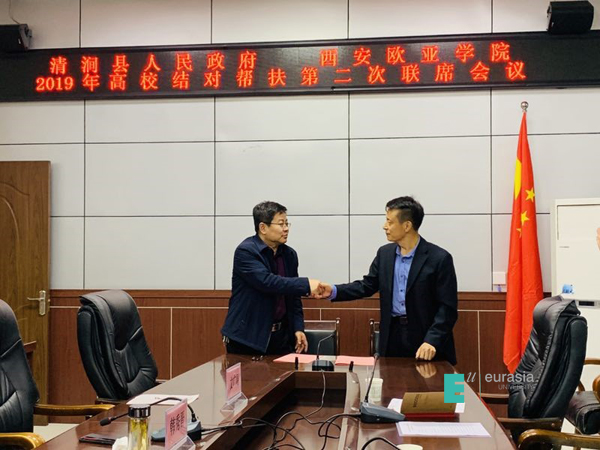 25日上午,与清涧县政府高明伟县长对清涧县脱贫情况进行了沟通交流,围绕教育帮扶交换了意见。高明伟县长主要介绍了清涧县脱贫现状,于孟晨书记介绍了学校的发展和对教育帮扶工作的思路和想法。随后,在县政府会议室,清涧县与我校召开了“双百工程”联席会议。一是经过前期的反复沟通协调,双方达成了2019年帮扶协议,由我校工会副主席晏建忠代表学校与清涧县政府主管扶贫工作的副县长韩秀晋代表双方签订了《西安欧亚学院与清涧县2019年教育帮扶协议》;二是为实施产学研帮扶、推进合作项目落地,我校文化传媒学院党总书记左伟介绍了项目落地方案。三是讨论了2019年帮扶工作机制,确定教育局惠东平副局长担任欧亚学院教育帮扶协调人。